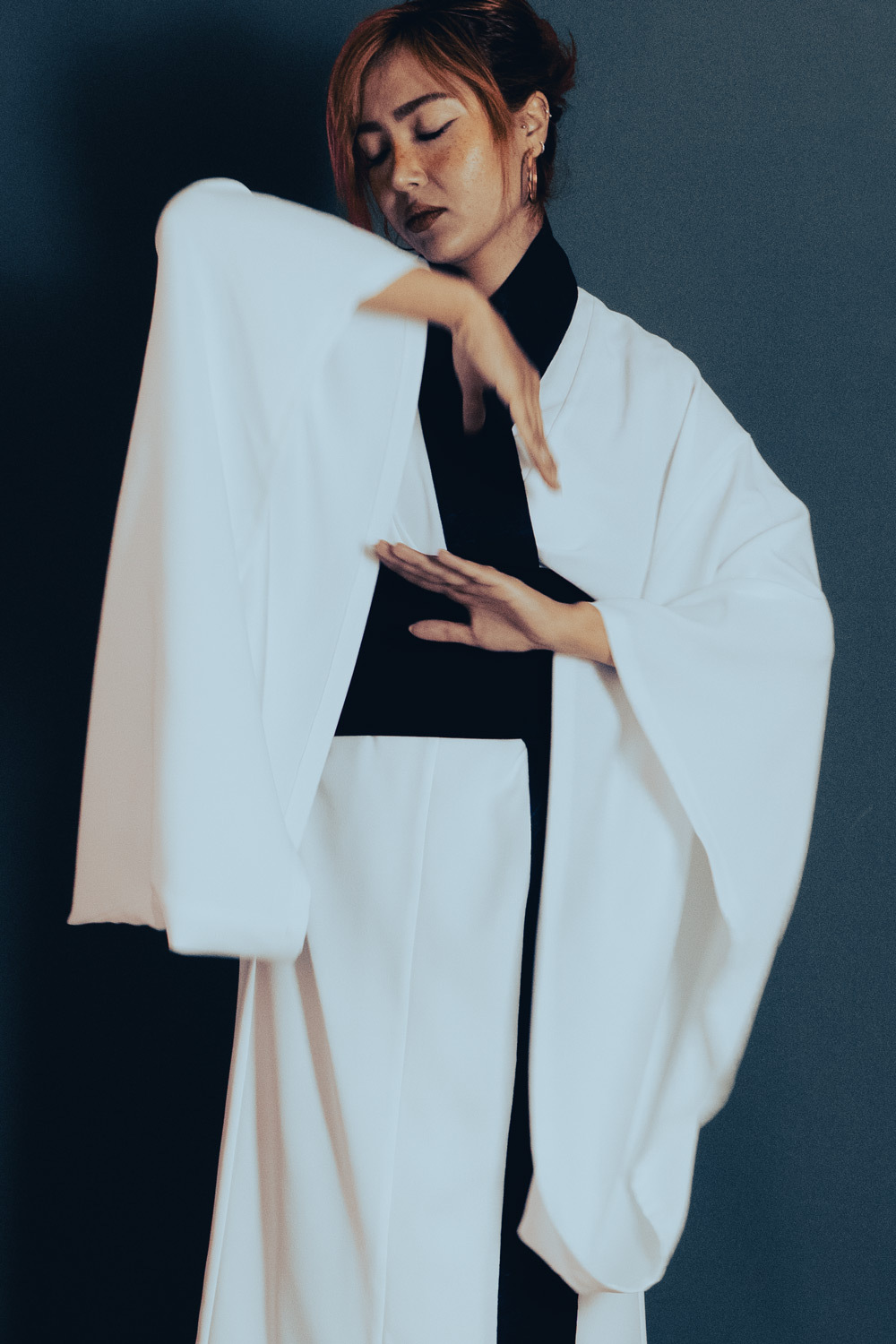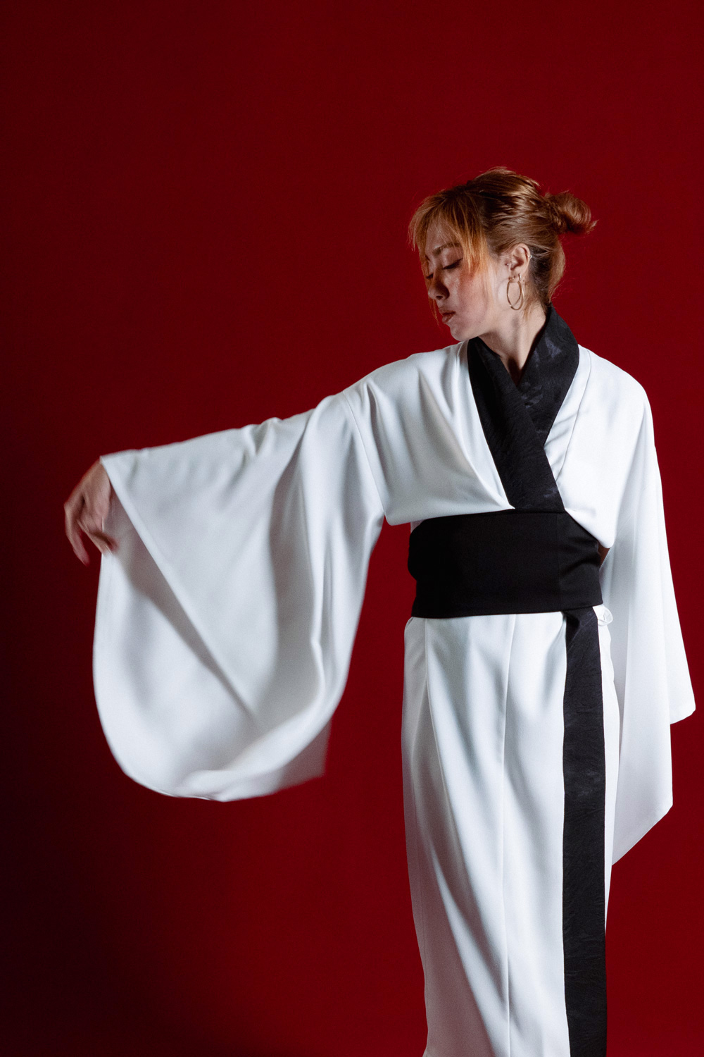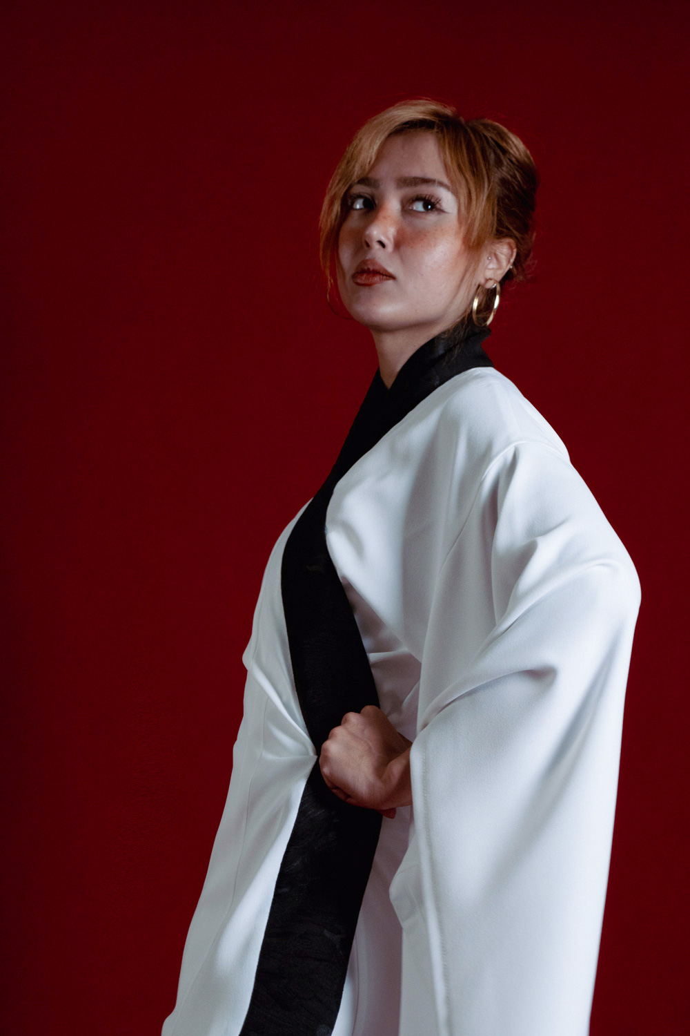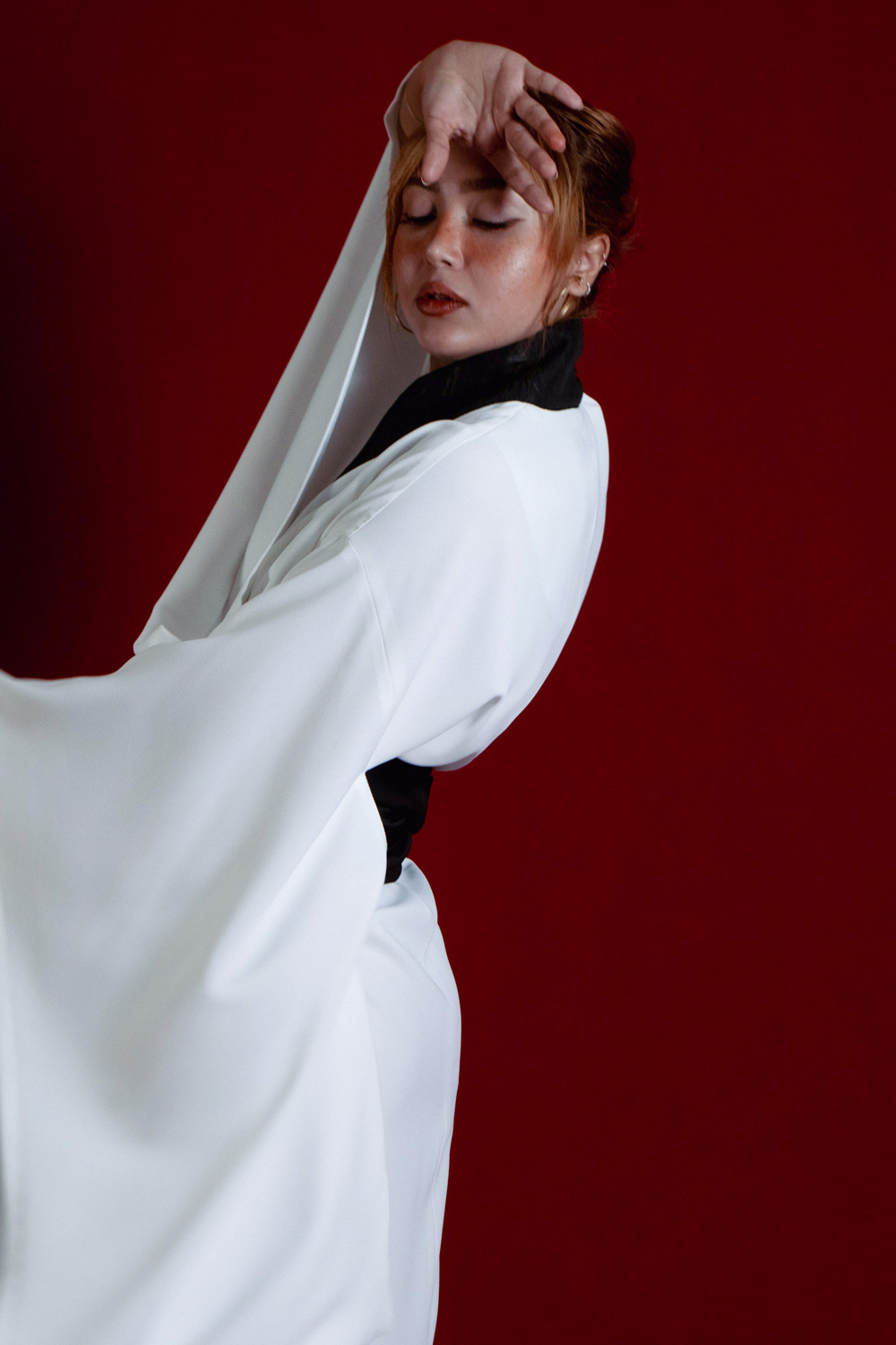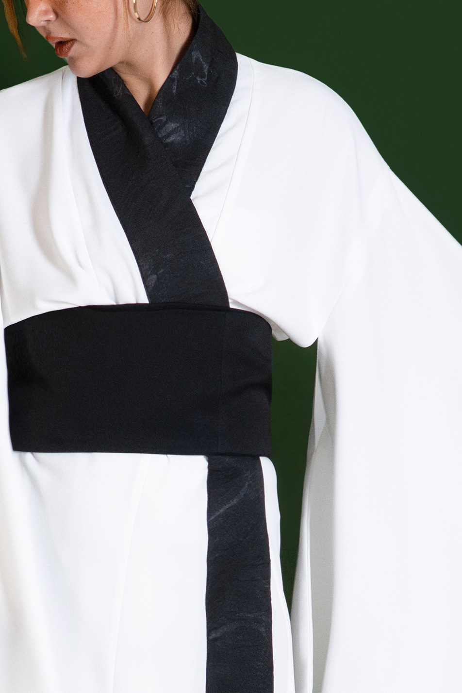 در امتداد این هماهنگی، نوار مشکی عمودی از یقه تا پایین دامن، نه تزئین که زبان لباس است؛ نشانهای از جریان انرژی درونی، یا همان «کی»، که در طراحی کیمونوهای کلاسیک نیز حضور دارد. تضاد سفید و مشکی نه برای نمایش، بلکه برای معناست: تعادلی میان روشنایی و سایه، میان حضور و غیاب.