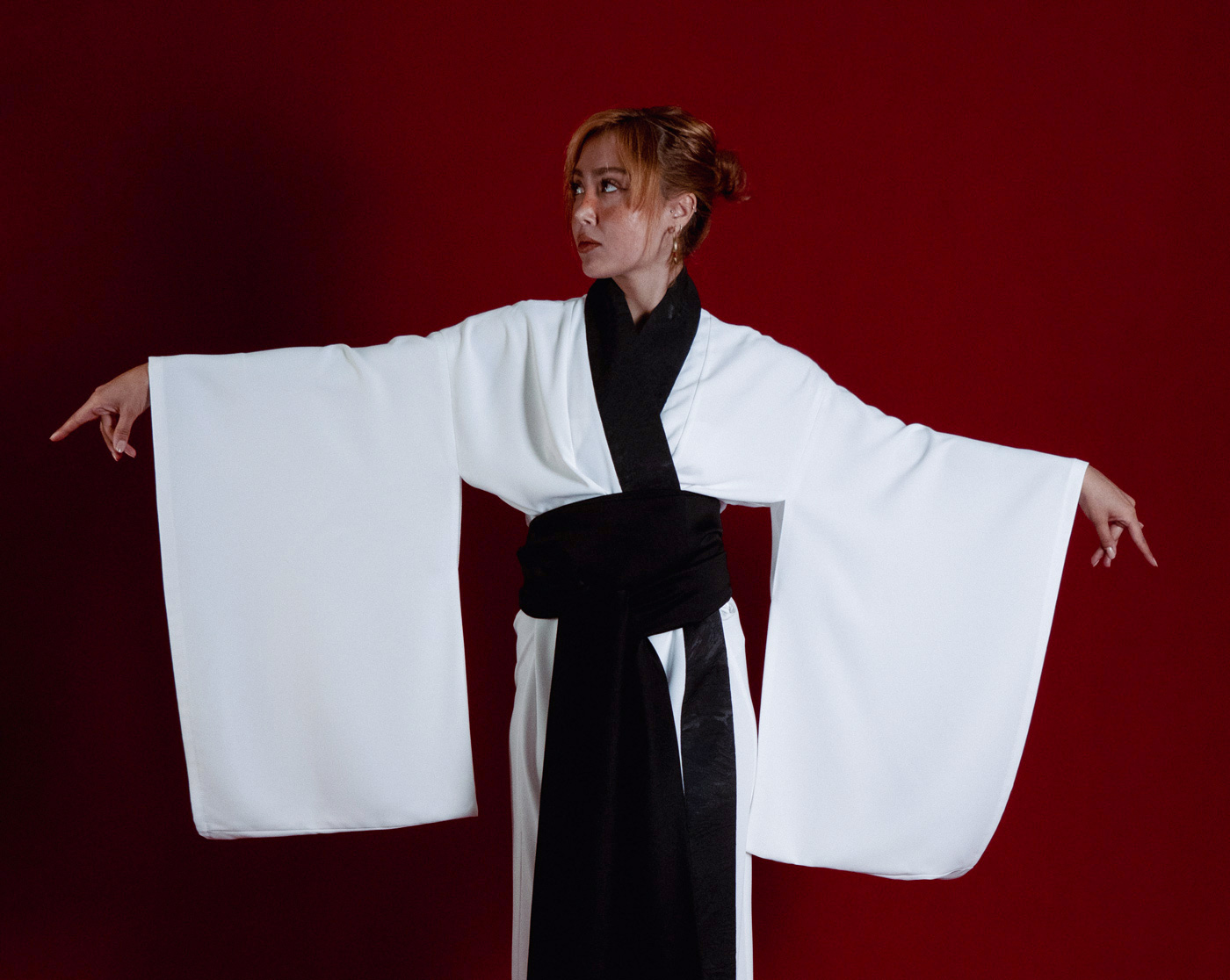 فرم آستینها یادآور سُودههیرُو (袖広) است، آستینهای آزاد و بلند که به لباس حالتی شناور و شاعرانه میبخشند. حرکت پارچه در هر چرخش، نوعی رقص بصری خلق میکند؛ بیصدا و بیتکلف، اما پر از حضور.