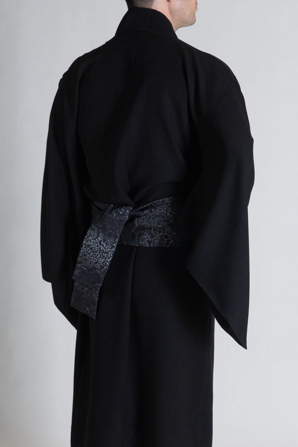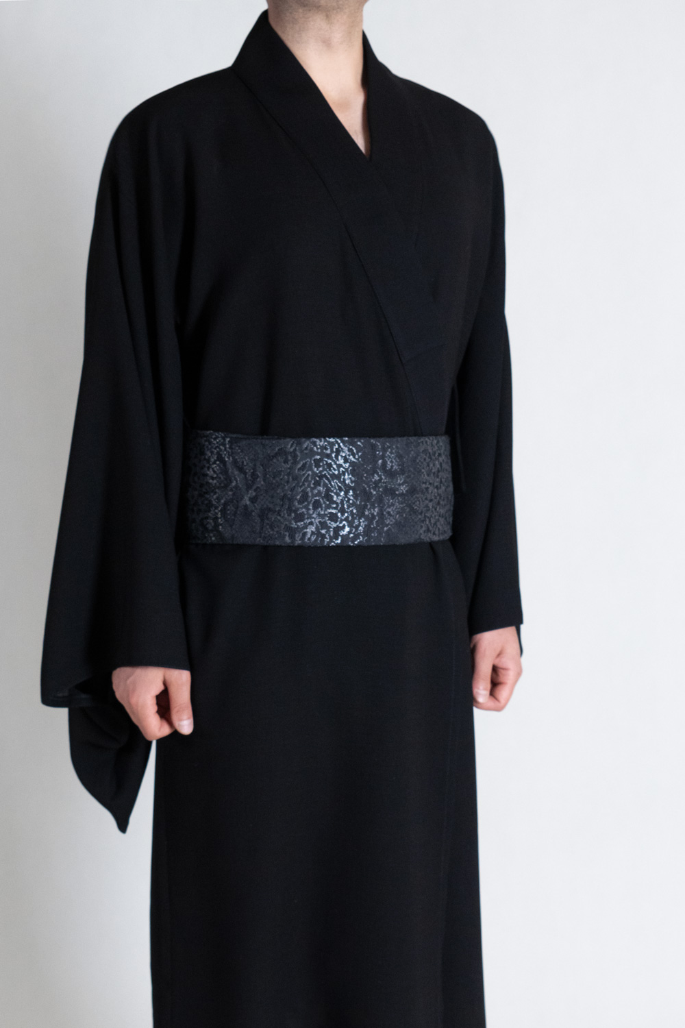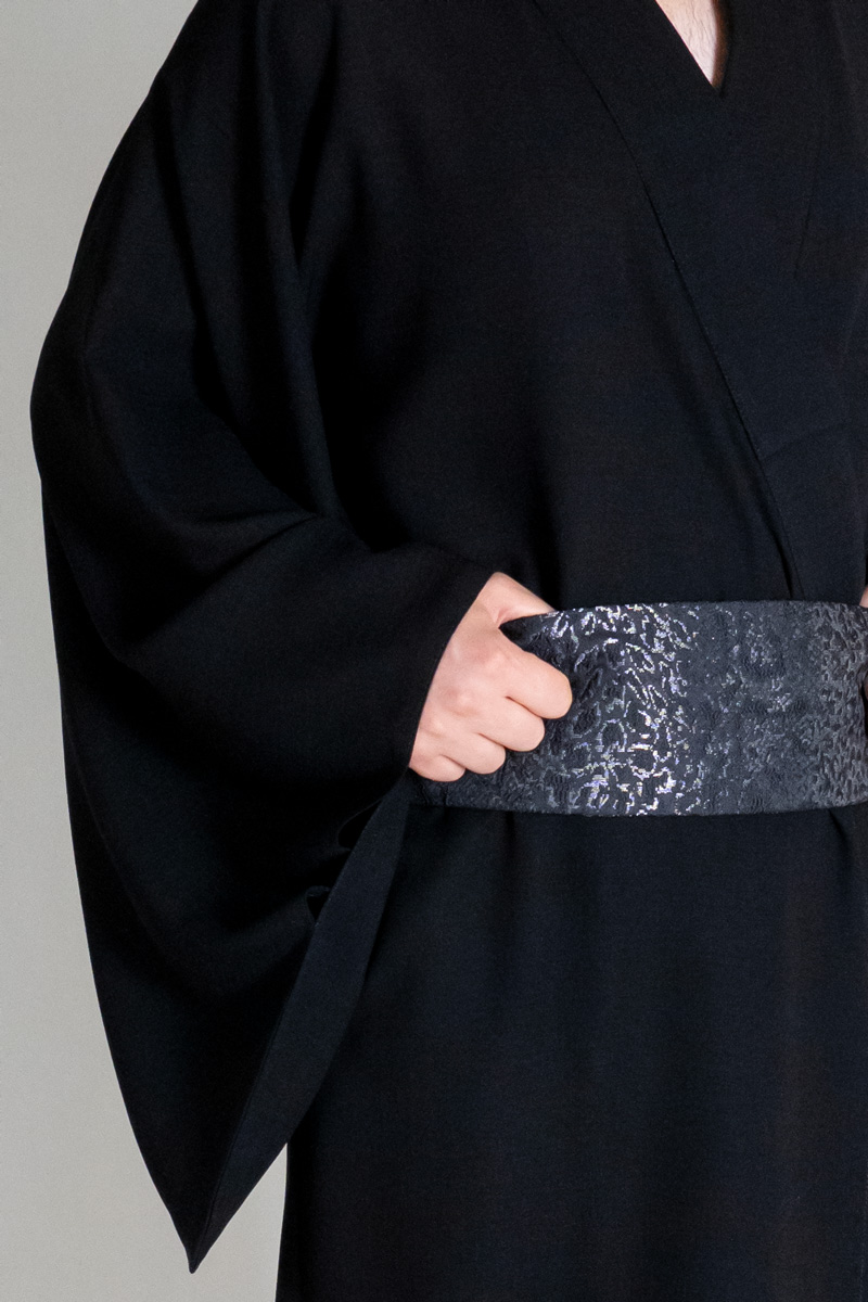 کمربند اوبی از ژاکارد با طرح برجسته بافته شده است. سطح براق و پیچیدگی نقوش ژاکارد در تضاد با بافت طبیعی و نیمهمات شانتون قرار میگیرد؛ همین تضاد است که نگاه را نگه میدارد. اوبی، فقط یک جزئیات تزئینی نیست؛ نقطهی تمرکز بصری لباس است، جایی که ساختار و ریتم رنگ در هماهنگی کامل قرار میگیرند.