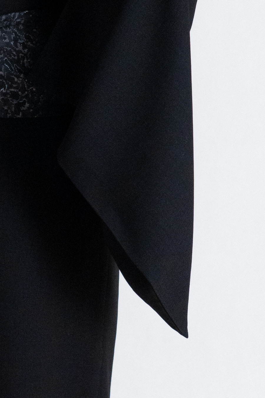 زیبایی زمانی معنا پیدا میکند که ساختار و جزئیات در تعادل باشند. این کیمونو از پارچهی شانتون مشکی دوخته شده؛ پارچهای با بافتی ظریف و سطحی زنده که در برخورد با نور، عمق خود را آشکار میکند. شانتون بهدلیل تراکم متعادل تار و پودش، ایستایی کنترلشدهای دارد؛ نه خشک و رسمی، نه رها و سبک. انتخابی دقیق برای لباسی که باید هم وزن داشته باشد و هم حرکت.