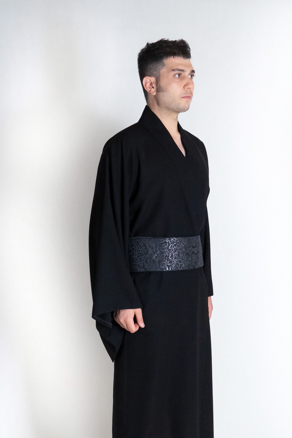 فرم کلی کیمونو بر اساس الگوی سنتی ژاپنی طراحی شده اما در جزئیات دوخت و تناسب خطوط، نگاه معاصر کیاموکی حضور دارد. پهنای آستینها، محل اتصال سرشانه، و یقهی ایستادهاش با اندازهگیری میلیمتری اجرا شده تا لباس در حالت پوشش، نه تنها خوشفرم بایستد بلکه ساختار بدن را هم محترم بدارد. در این طراحی هیچ عنصر تزئینی اضافی وجود ندارد؛ تنها برش، بافت و دوخت هستند که ارزش را میسازند.
